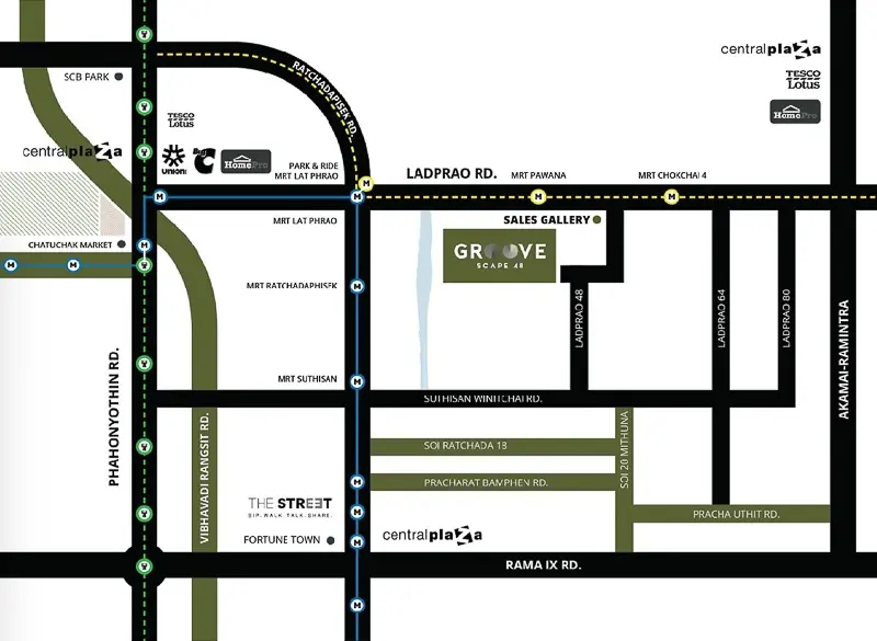 Groove Scape 48 คอนโดใหม่แต่งครบ ทำเลใจกลางลาดพร้าว เชื่อมต่อเข้าออกเมืองได้สะดวก ใกล้ทางด่วน ใกล้รถไฟฟ้าสายสีเหลือง เพียง 1 สถานีถึงสถานีเชื่อมต่อสายสีน้ำเงินสถานีลาดพร้าว